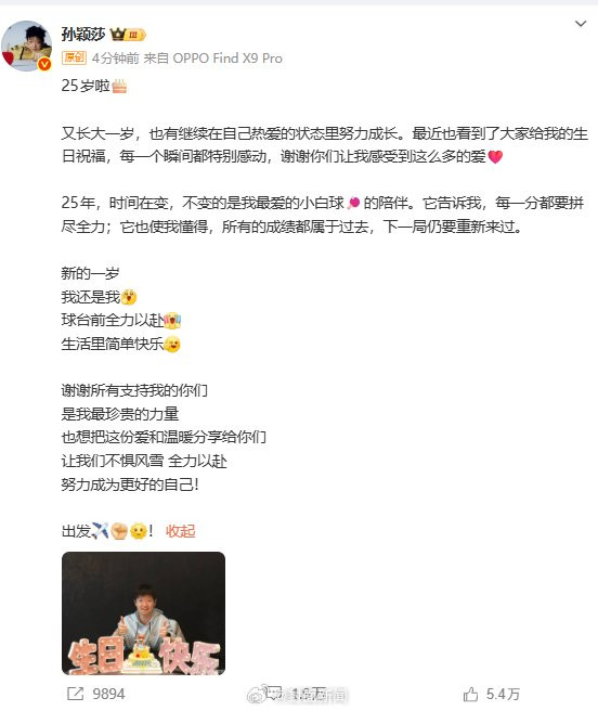 [#孙颖莎说25岁我还是我#]#孙颖莎最爱的还是小白球#11月4日,@孙颖莎25岁生日晒照发文:25岁啦🎂又长大一岁,也有继续在自己热爱的状态里努力成长。最近也看到了大家给我的生日祝福,每一个瞬间都特别感动,谢谢你们让我感受到这么多的爱25年,时间在变,不变的是我最爱的小白球🏓的陪伴。它告诉我,每一分都要拼尽全力;它也使我懂得,所有的成绩都属于过去,下一局仍要重新来过。